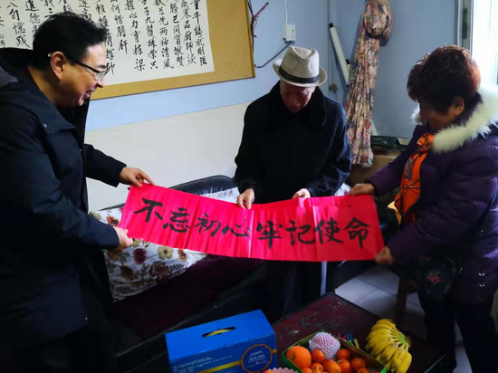 值此新春佳节即将到来之际,凤校长代表学校看望各位老师,他希望大家在新的一年中阖家欢乐、万事如意。在老校长刘宏匡家中,刘校长为前来慰问的行政们展示书法作品“不忘初心,牢记使命”,叮嘱大家一定要守住教书育人的初心,牢记立德树人的使命,建设好四中,为郫都教育、为祖国的教育献出一份力量。