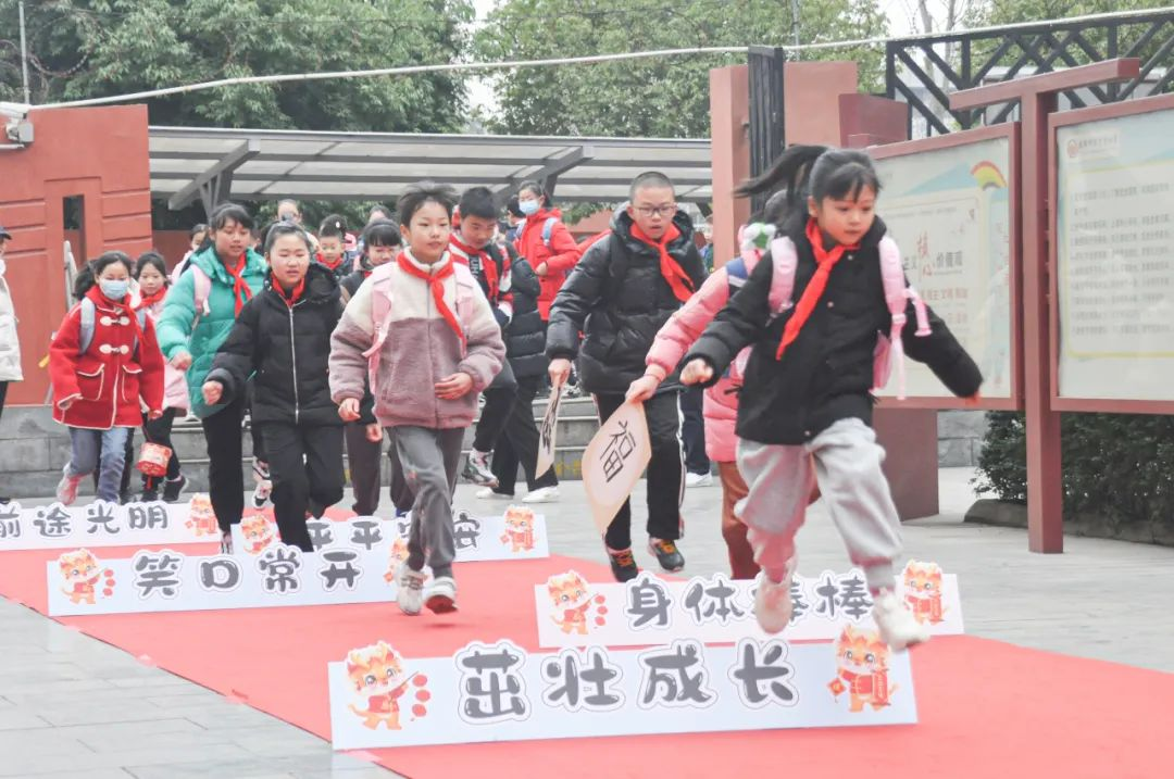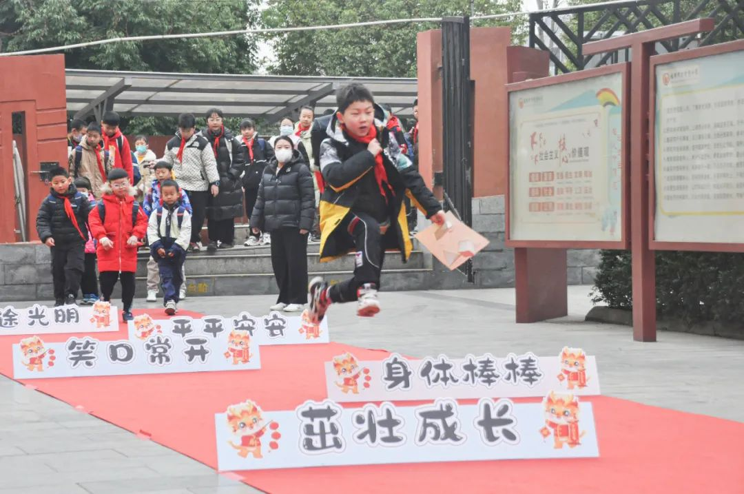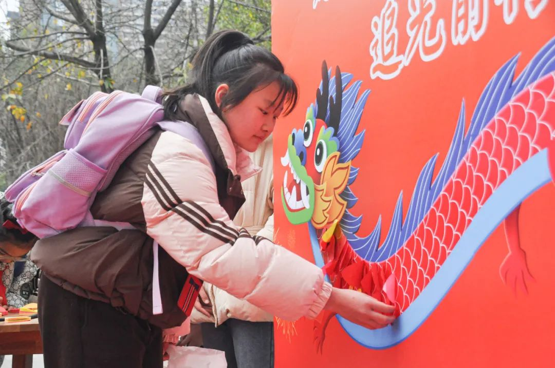 同学们走过红毯,跨过了一个个学校对他们的诚挚期许,让他们在新的学期有了新的梦想与期待。随后,同学们纷纷在心愿贴上写下了自己的新学期新愿望,贴在了新年龙身上。为龙贴麟,愿新年可以龙腾虎跃。