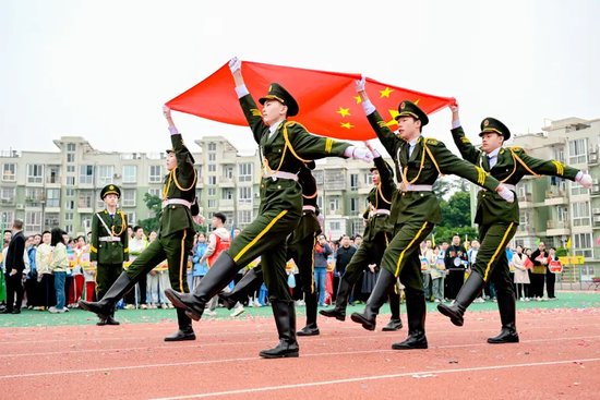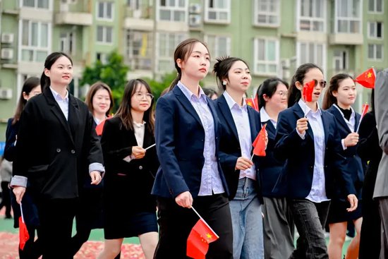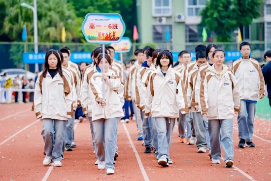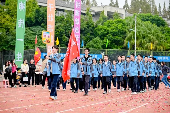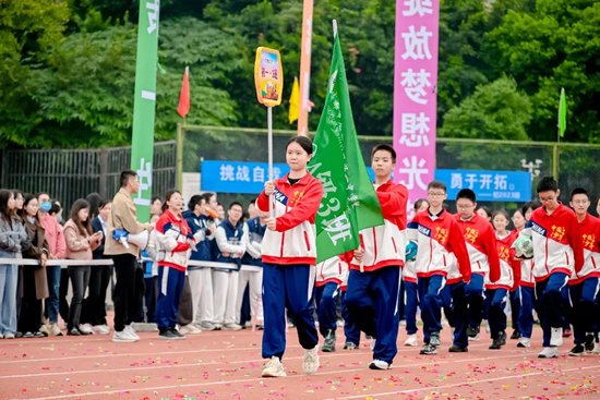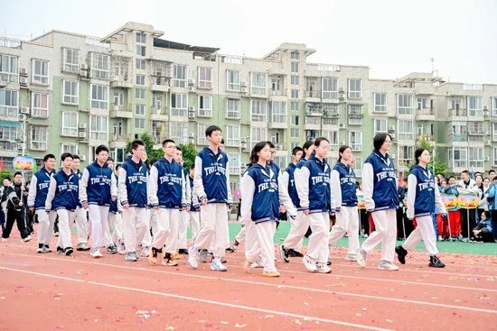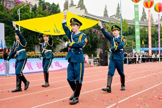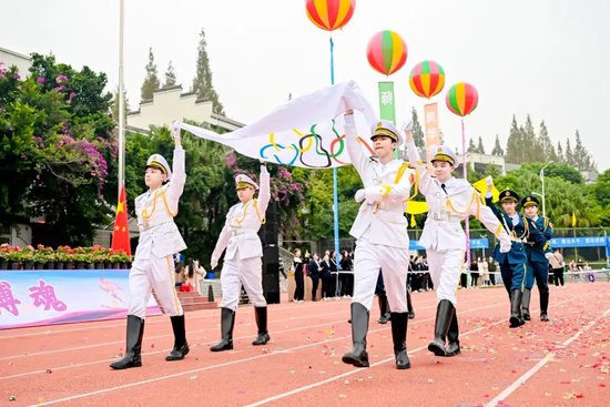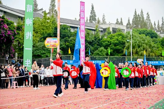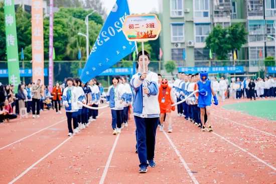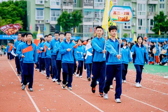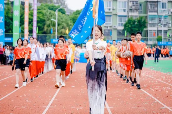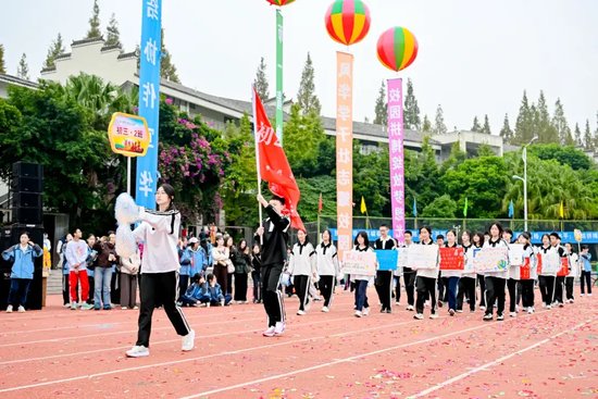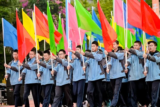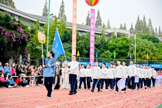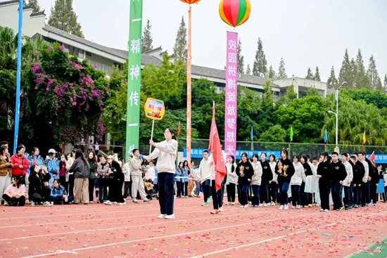 色彩斑斓的校旗、会旗和彩旗在蓝天下飘扬,如同青春的画卷缓缓展开。