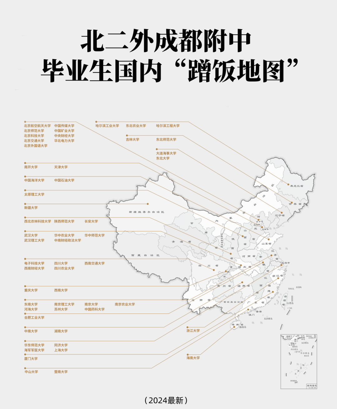 从家长群流传的“蹭饭地图”中可以看到,毕业生被浙江大学、同济大学、哈工大、厦大、北师大、北航、陆军工程大学、海军军医大学等名校录取,更有学生通过强基计划进入川大等顶尖985高校。