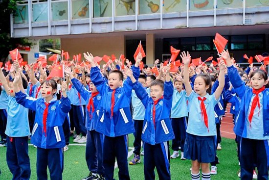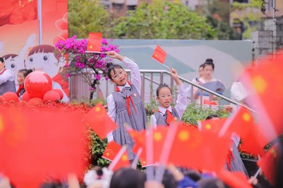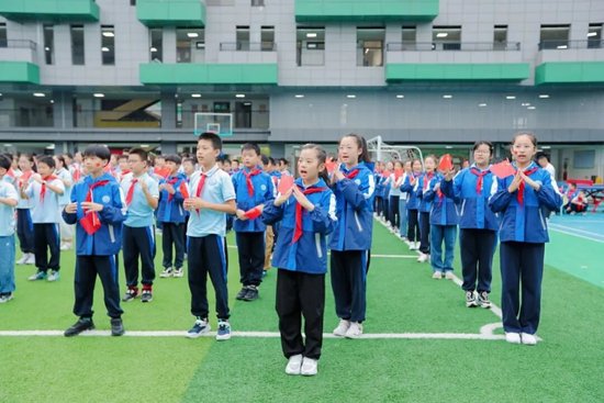 各年级在中队辅导员老师的带领下,用嘹亮的歌声展示少先队组织的活力与风采。每一句歌词都是一次情感的传递。年级间的互动口号、此起彼伏的掌声喝彩,让整个校园沉浸在红色的海洋中。