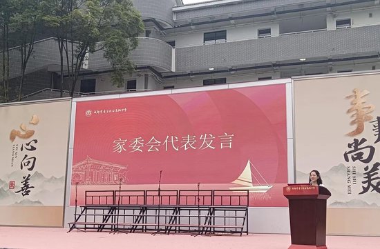 党雷校长为家委会成员颁发聘书。校级家委会主任、高一(1)班周焕然同学家长代表家委会发言,表示将与学校携手“陪伴孩子成长”,多一份理解与配合,少一份顾虑与观望,共同见证孩子从懵懂走向成熟,成长为眼里有光、心中有梦、脚下有路的新时代青年。