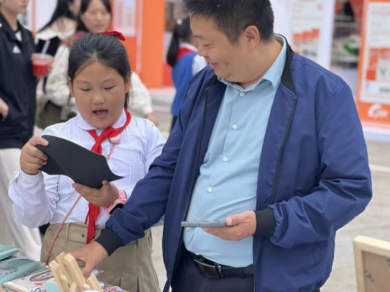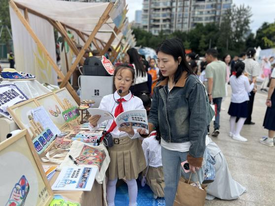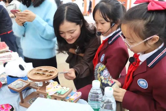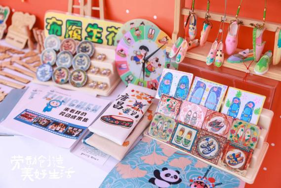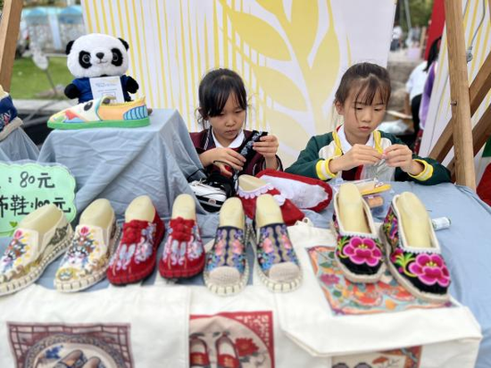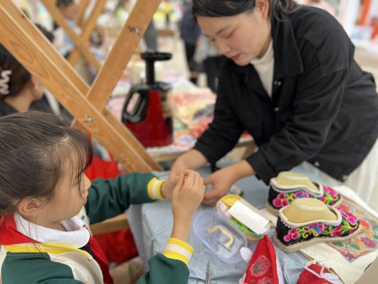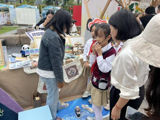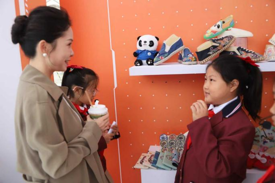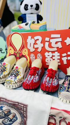 活动最富活力的篇章,是热闹的爱心市集。展台满缀唐昌布鞋衍生品:印传统云纹的冰箱贴闪着微光,缀 “砂边” 工艺的挂坠摇曳生姿,拼蜀绣纹样的布艺包藏着巧思,更有借 AI 技术衍生的文创 ——AI 设计纹样的书签、AI 生成布鞋元素的手账,每一件都是古法、新意与科技的交融。穿梭其间的 “小小非遗讲解员” 更添独特风景,她们自信道:“这挂坠纹路,和清代布鞋‘万字纹’同源!” 稚嫩却流畅的讲解让非遗知识成了故事,小小身影也成了古老技艺与现代生活最鲜活的纽带。