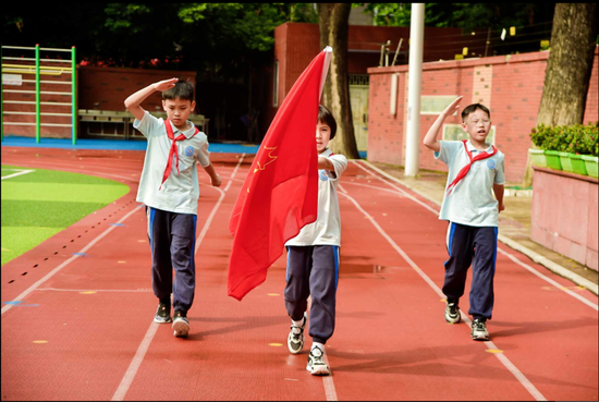 伴随着激昂的出旗曲,护旗手迈着坚定的步伐入场,鲜红的队旗在阳光下熠熠生辉。