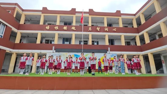 三年级(2)班班的同学们身穿校服,胸前的红领巾格外鲜艳,《祖国有我》的歌声坚定有力,“请党放心,强国有我”的誓言响彻校园;