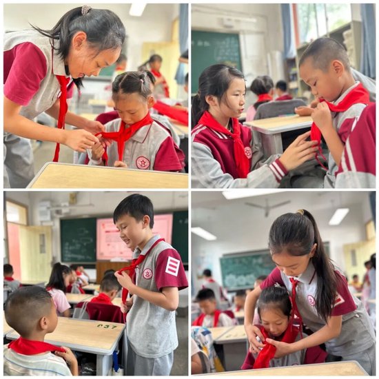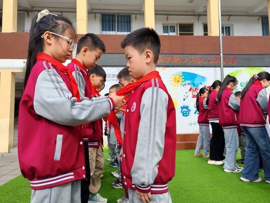 最温馨的环节如期而至,老队员们手持崭新的红领巾,走到新队员面前,小心翼翼地为他们系上。交叉、绕圈、打结,每一个动作都格外认真,当鲜艳的红领巾在新队员胸前飘扬,小脸上都绽放出自豪的笑容,这是使命的传递,更是红色精神的延续。