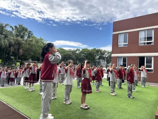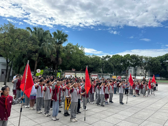 伴随着激昂的出旗曲,少先队旗手迈着整齐有力的步伐,护送队旗缓缓前行。全体师生肃立,新老队员共同举起右手敬队礼,目光紧紧追随鲜红的队旗,心中满是对少先队的崇敬与向往。