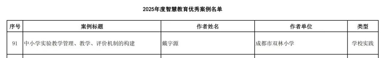 · 2025年7月,戴宇源老师的《中小学实验教学管理、教学、评价机制的构建》入选全球智慧教育大会“2025年度智慧教育优秀案例”