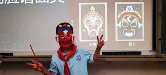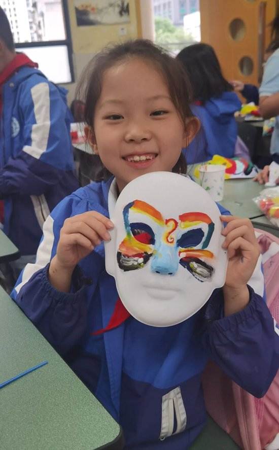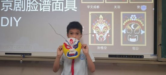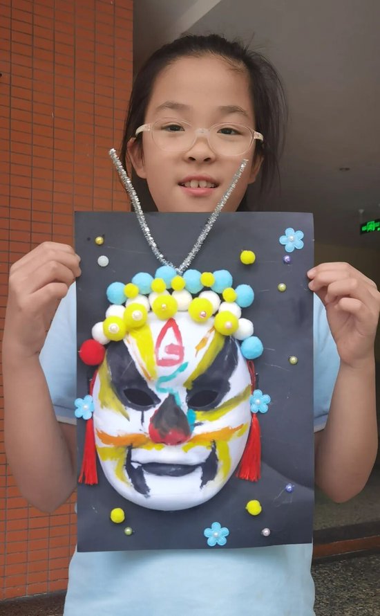 “我画的脸谱颜色可鲜艳了,因为我想表现戏曲里英雄的厉害!”