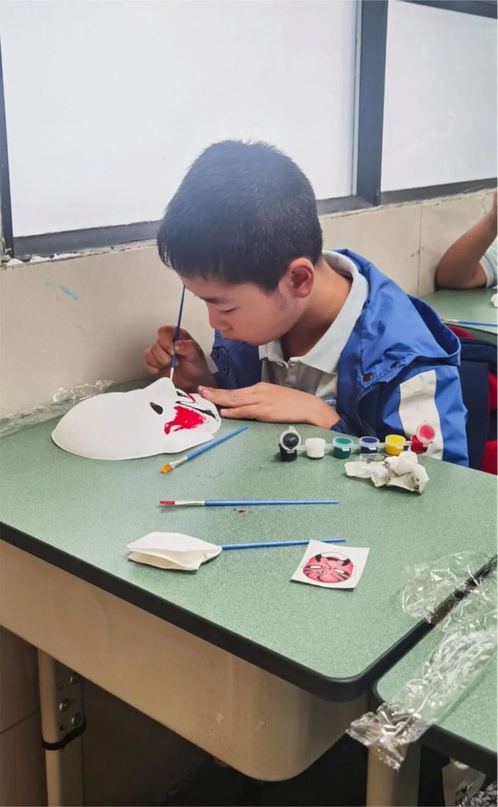 随后,最受欢迎的手工 DIY 戏曲脸谱环节开始啦!孩子领到脸谱材料包和画笔,在老师的指导下变身 “小小脸谱师”,认真地描边、填色、创作。有的孩子复刻传统脸谱经典样式,有的则大胆创新,画出专属自己的创意脸谱。笔尖舞动间,一个个空白模具被赋予了色彩与故事,一张张充满童趣的脸谱新鲜 “出炉”。