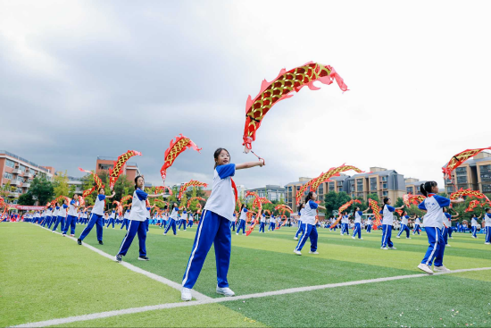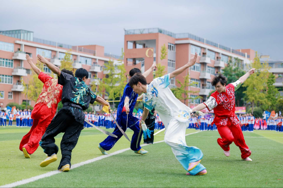 随后,初2025级同学献上《龙腾少年志・武韵展风华》。彩带翻飞如龙腾云海,拳脚起落似虎跃山林,他们将传统武术与现代韵律完美融合,展现出少年刚劲与灵动并存的成长力量。