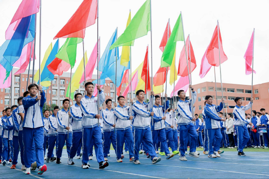 随后,彩旗队手持五彩旗帜迎风而来,象征着校园生活的丰富多彩与青春梦想的绚烂绽放。