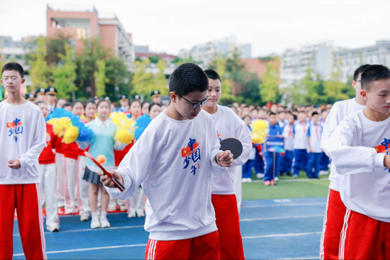 其他年级的同学以其朝气与创意令人眼前一亮:他们别出心裁地将乒乓球、羽毛球等运动元素作为入场式的创意核心,手持特色道具,模拟精彩对打的场景,用队列勾勒出球拍的轨迹与运动的弧线。在动静结合之间,既保留了笔墨书香的儒雅,也尽显运动豪情,用独特的演绎诠释了“团结拼搏”的集体精神。