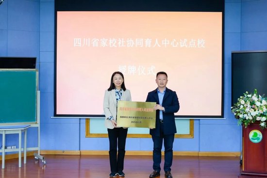 四川省妇联、省校家社协同育人中心刘芃主任将“四川省校家社协同育人示范校”的牌匾交予邱华校长手中。