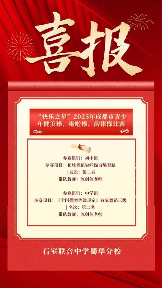 捷报频传,锐不可当!在10月25-26日由成都市教育局、成都市体育局联合主办的“快乐之星”2025年成都市青少年健美操、啦啦操、韵律操比赛中,石室联中蜀华分校高段啦啦操队作为一支年轻的队伍,在与全市700余支精英队伍的激烈角逐中,顶住压力,再次凭借稳定的发挥和出色的表现,荣获两项市级第二名!