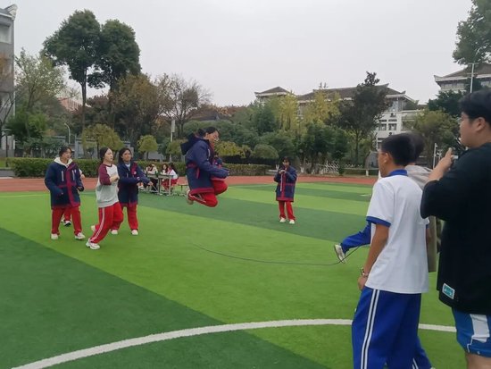 解救队友——2名队员负责摇绳,其余队员需在行进间连续跳绳通过30米赛道,成功抵达“安全区”。摇绳接力,每一秒都是紧张与感动。