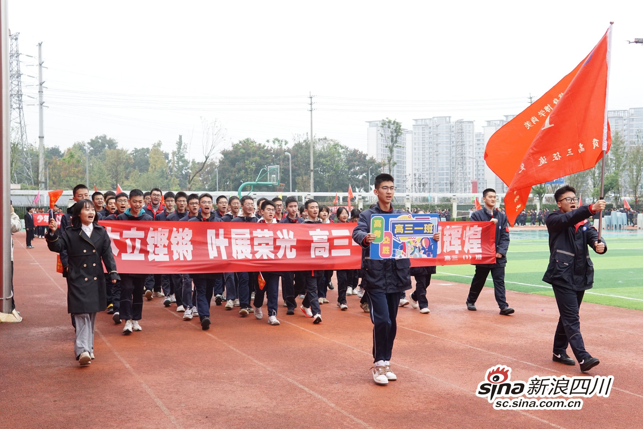 初二、初三年级,高二、高三年级以班级为单位,呐喊着响亮的口号、迈着整齐的步伐入场,展示班级文化。