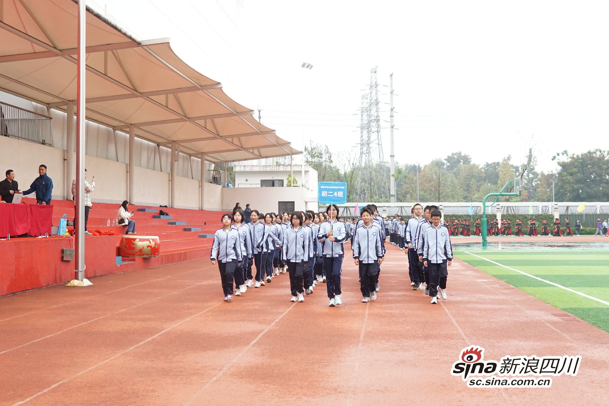 在雄浑激昂的乐曲中,国旗、校旗、会徽、家长、教师、年级主题方阵依次入场。