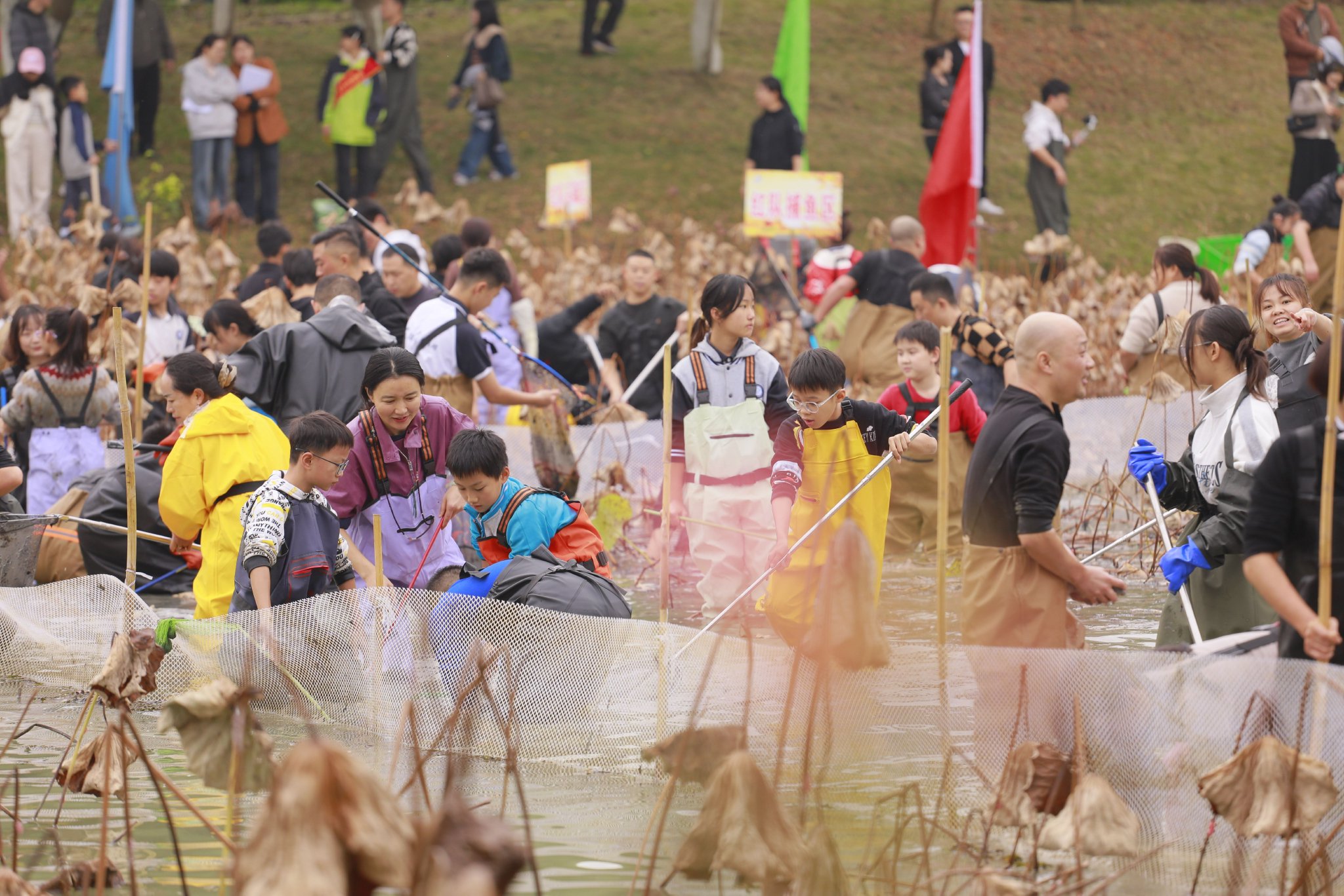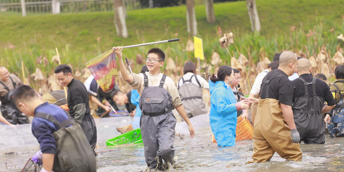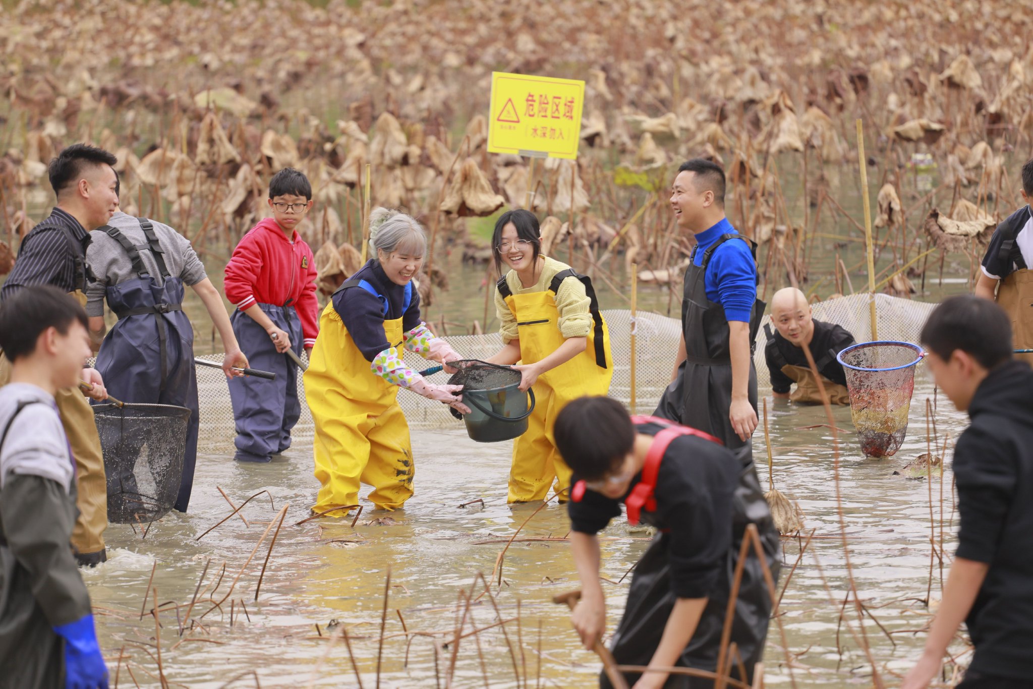 他们分为红、蓝两队打“团队赛”,有的人小心翼翼地穿梭在藕塘里,聚精会神地寻找大鱼的踪迹;有的人弯腰在池底摸索,探寻莲藕的根系……溅起的泥点落在家长和学生的头上和衣服上,没有人嫌脏嫌累,只有脸上露出的快乐和满足。每当他们捕到鱼,岸上的“亲友团”都会爆发出欢呼和掌声,连湖边的鹅和鸭子都为他们喝彩,现场欢声笑语不断,氛围其乐融融。