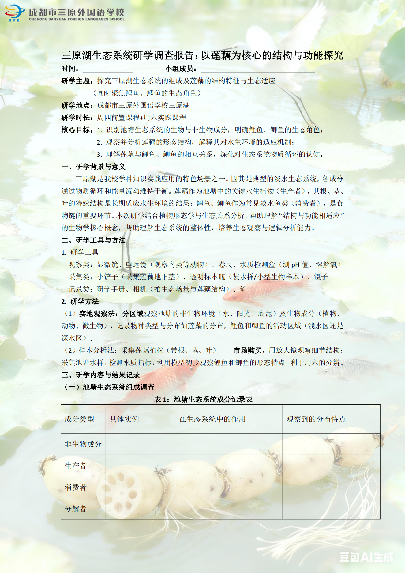 在活动开始之前,初二年级的生物老师就已经给同学们开展了前置课程《三原湖生态系统研学调查报告:以莲藕为核心的结构与功能探究》,带领同学们识别池塘生态系统的生物与非生物成分,明确生活在三原湖里的鲤鱼、鲫鱼的生态角色;观察并分析了莲藕的形态结构,解释其对水生环境的适应机制;理解莲藕与鲤鱼、鲫鱼的相互关系,深化对生态系统物质循环的认知。