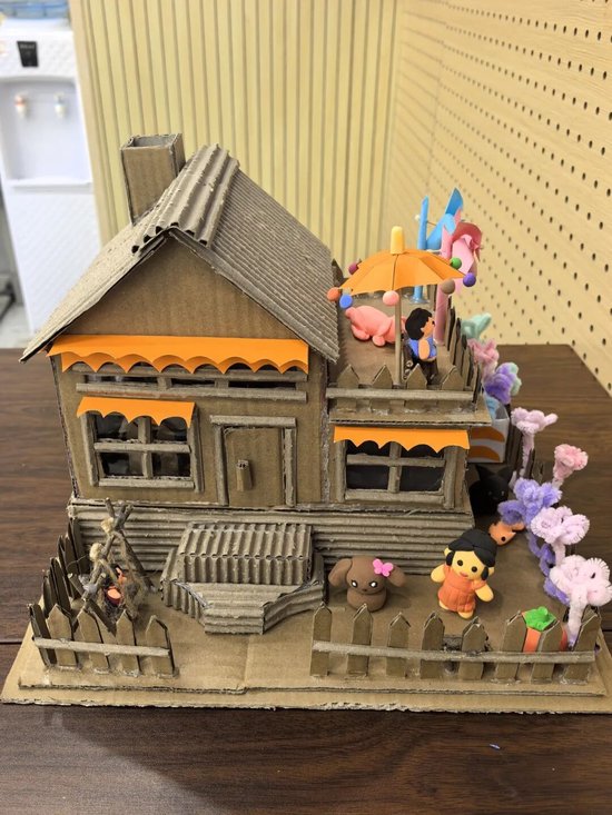 依托保护母亲河“碳”索联盟项目,二年级孩子们开展生态房屋设计与推广活动。学生以废纸板为核心材料,制作融入节能、资源循环理念的生态房屋,直观普及废旧资源回收知识,引导师生养成循环利用习惯,推动绿色环保氛围形成。