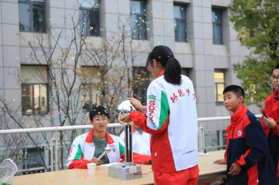 静电飞花、火焰在掌心燃烧、植物通过染色展现出斑斓色彩……在学科教师的指导下,同学们现场演示了一系列富有趣味性和启发性的实验。生物组展示了动植物细胞模型、植物染色与拓染等;物理组再现了范式起电机、马德堡半球实验等经典场景;化学组则呈现“火焰掌”“碘钟反应”等视觉奇观,引来阵阵喝彩。