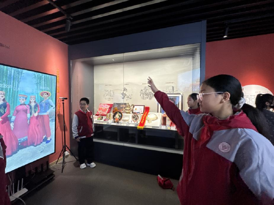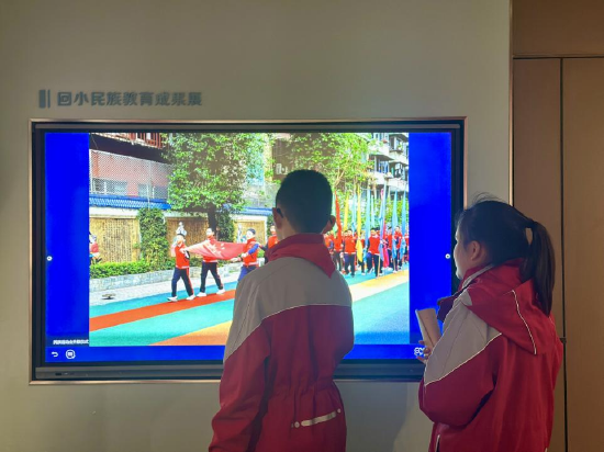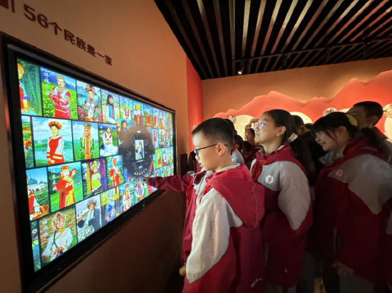 在博物馆的民族团结主题展区,两校学生共同参与了富有仪式感的数字互动活动。“民族节日故事汇”中,两校学生结对合作,通过数字抽签认领不同民族的节日故事,携手完成讲述任务;“民族节日数字长卷”共创环节,两校学生在同一块电子屏上共同绘制展现各民族节日习俗的数字画卷。