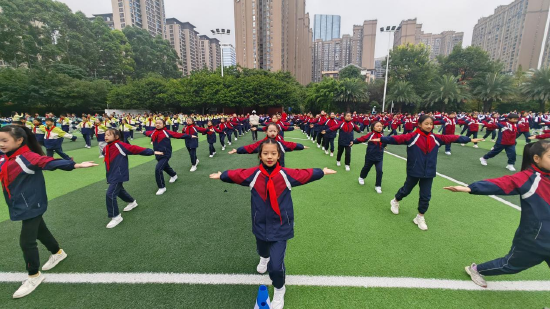 开幕式后,赛场迅速切换到“高能模式”。2-6年级的同学们率先登场,伴随着熟悉的旋律,他们动作标准、精神饱满地完成了《七彩阳光》广播体操展示,整齐划一的姿态成为赛场上一道靓丽的风景线。