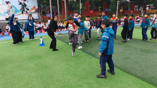 紧接着,不同年级的特色赛事轮番上演:1年级的“爬行接力比赛”萌趣十足,小萌娃们手脚并用地向前冲刺,稚嫩的脸上写满认真,引得场边观众阵阵欢笑;3-6年级的“跳长绳”比赛则充满默契,绳子在空中划出优美的弧线,队员们鱼贯而入、快速跳跃,每一次成功的接力都伴随着欢呼;1-2年级的“春种秋收”比赛更是创意满满,小运动员们化身“小小农夫”,在模拟的田地里完成“播种”与“收获”的任务,在运动中感受劳动的快乐。