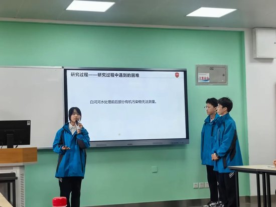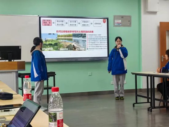 依托16年实践经验,学校创新构建小初高一体化生态教育体系。小学段以观察体验为主,初中段聚焦流域生态调研与数据分析,高中段深化科研转化,形成“低段启趣、中段提能、高段攻坚”的育人链条。此次汇报的《白河流域泥沙堆积问题探究》《白河边坡土壤与植被对边坡防护的影响》《水有机污染物处理措施研究》三大课题,正是学校16年一体化生态教育的阶段性结晶,涵盖初高中学段,既延续了长期跟踪研究的传统,又融入了新时代生态保护理念,充分展现了梯度化育人的显著成效。