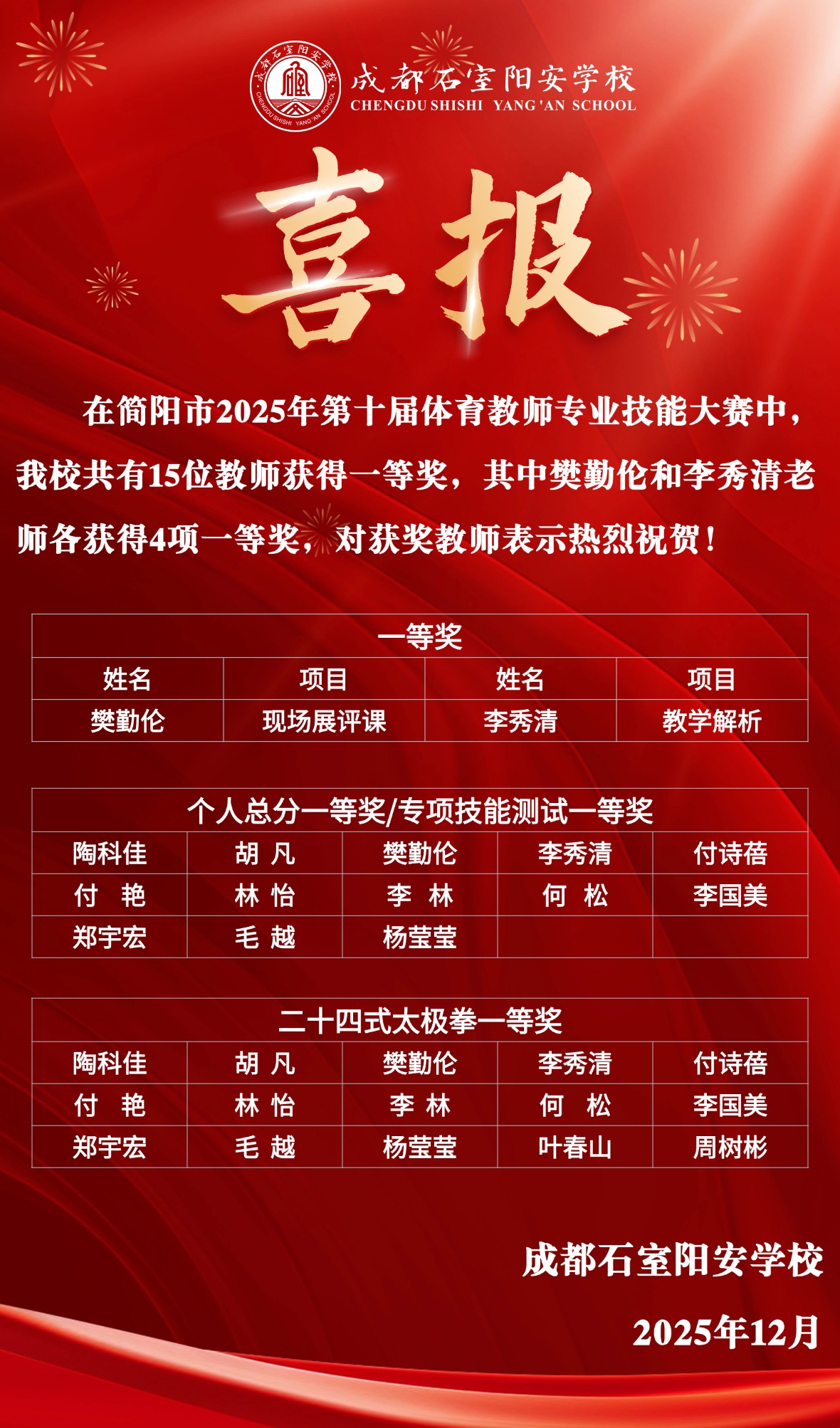 不仅文化课教学成果斐然,学校体育教育亦展现雄厚实力。在简阳市2025年第十届体育教师专业技能大赛中,学校体育教师团队凭借全面的专业技能和出色的综合素质,取得历史性突破。樊勤伦、李秀清两位老师各获四项一等奖,表现尤为突出。学校共有15位教师获得个人总分及专项技能测试一等奖,并在“二十四式太极拳”集体项目中荣获一等奖,获奖人数与项目之多,充分证明了学校体育教师队伍专业技能的扎实与全面,展现了阳光健康、积极向上的校园体育文化。