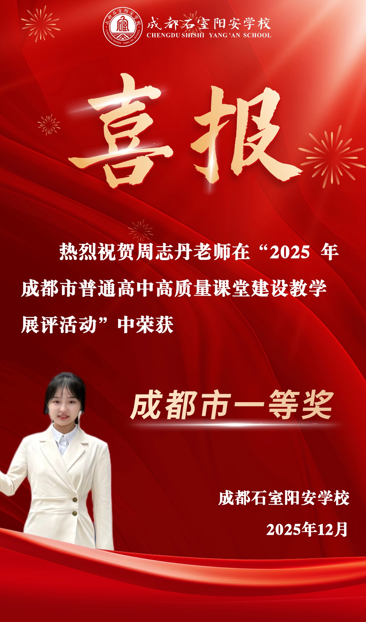 在成都市级平台上,学校教师同样大放异彩。周志丹老师在“2025年成都市普通高中高质量课堂建设教学展评活动”中脱颖而出,荣获成都市一等奖,体现了学校在落实新课标、构建高效课堂方面的积极探索与丰硕成果。