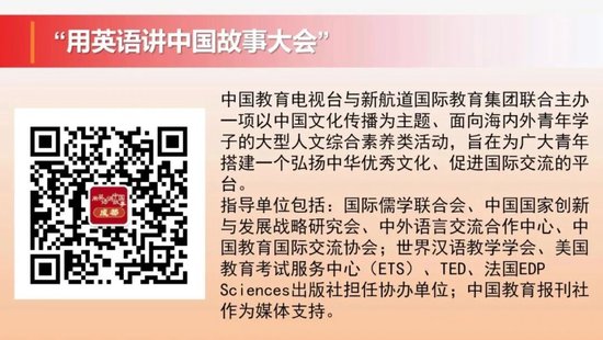 “用英语讲中国故事大会”是中国教育电视台与新航道国际教育集团联合主办一项以中国文化传播为主题、面向海内外青年学子的大型人文综合素养类活动,大会秉承“中华文化 世界传播”的愿景,旨在为广大青年搭建一个弘扬中华优秀文化、促进国际交流的平台。