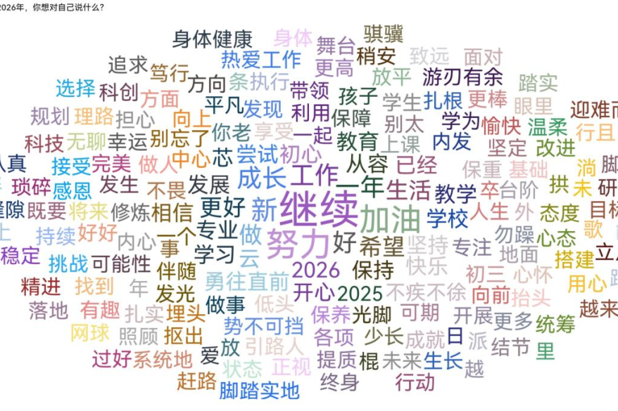 2025年的最后一次全校教职工大会,我请大家用一个词、一句话,来定格属于自己的2025,并写下对2026的期待。这不是一份问卷,而是一次真诚的倾听;不是向上汇报,而是彼此看见。我想知道: