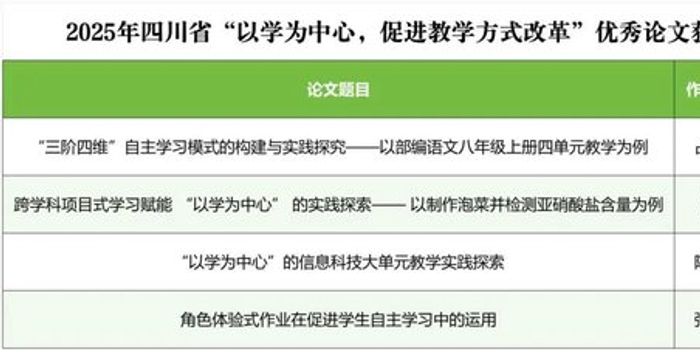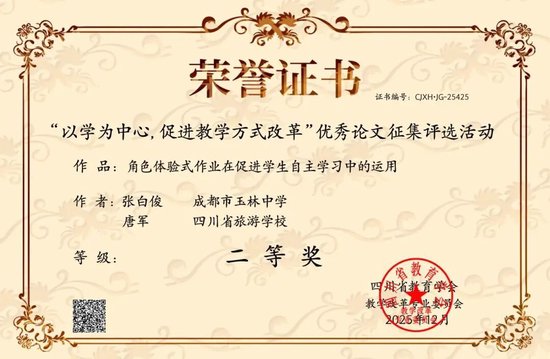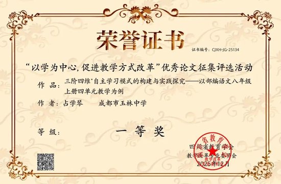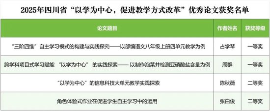 四川省教育学会主办的2025年度“以学为中心,促进教学方式改革”优秀论文评选结果揭晓。成都玉林中学教师围绕“以学为本”主题,从教学实际出发,以笔为耕、以研促教,共有4篇论文荣登榜单,充分展现了成都玉林中学教师在推动课堂教学改革、探索学习方式转型方面的实践智慧与专业风采。