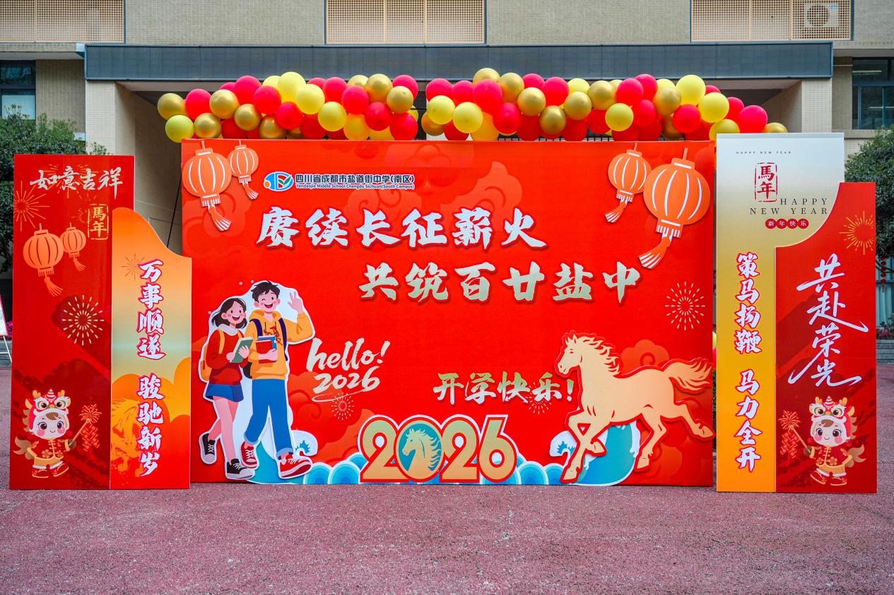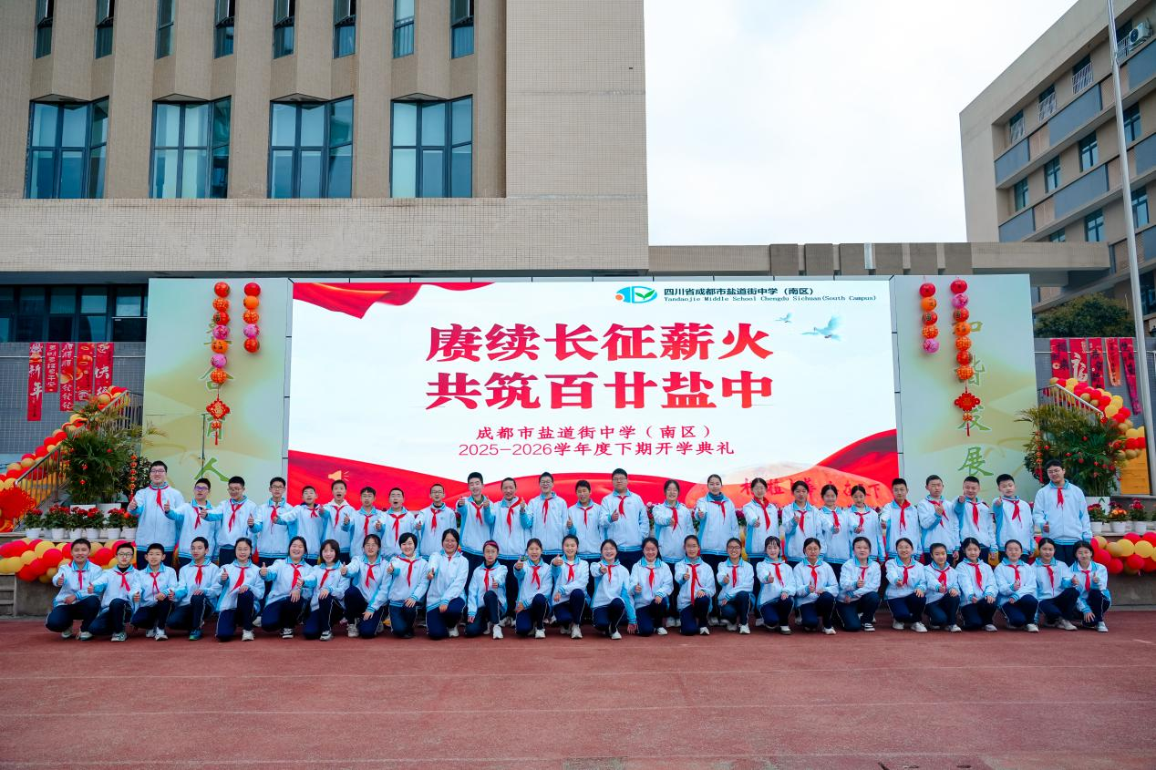 值此学校喜迎120周年校庆、长征胜利90周年之际,成都市盐道街中学两区三校点全体师生于2026年3月2日齐聚校园,举行以“赓续长征薪火 共筑百廿盐中”2025-2026学年下期开学典礼。