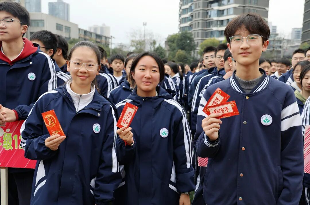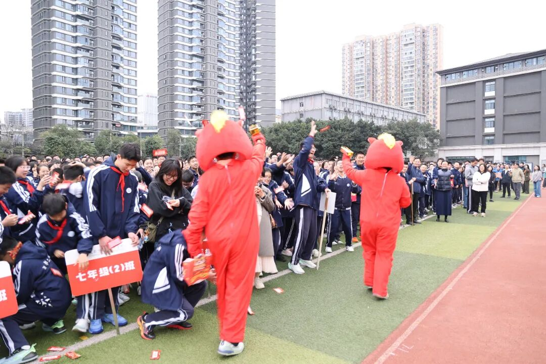 典礼尾声,学校吉祥物“廿宝”与马年人偶惊喜亮相,通过红包枪随机向师生发放“食堂免排队卡”“校长助理体验券”等趣味福利,在欢声笑语中开启新学期的征程。