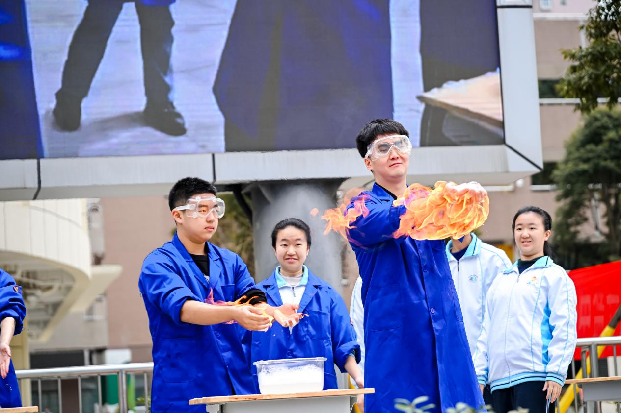 在初中部,四位思政教师以朗诵的形式解读长征精神,号召同学们传承长征精神、共筑美好未来;在高中部,特邀专家分享《用一个字读懂长征精神》,同学们还现场展示了化学实验,融长征精神与学术探索于一体,指引学子以科技为翼、创新为炬,深耕学术、勇探前沿。