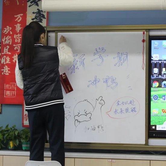 走进教学楼,每一间教室都被老师们精心装扮,窗明几净,暖意融融。黑板上,新学期的欢迎词格外醒目;课桌上,系着红丝带的新课本静静等待着小主人,诉说着新学期的无限可能。