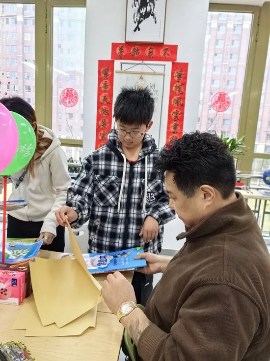 校园里不仅有师生重逢的喜悦,更有亲子相伴的温情。有的班级正在进行“亲子包书皮”活动。家长们手把手地教孩子怎么包得整齐,孩子们学得认真,包得仔细。