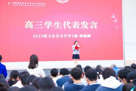 2023级文化艺术升学1班钟政维作为高三代表发言,她回望青苏成长路,解读“好瓷胜玉”的育人理念,感恩师长教导与同窗相伴,与高三学子共勉,愿冲刺阶段沉心备考、查漏补缺,以匠心迎战高考,让考场成为技能成才新起点;同时寄语学弟学妹珍惜时光、深耕技能,在打磨自我中绽放光彩,让青春因奋斗闪光。