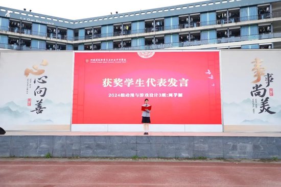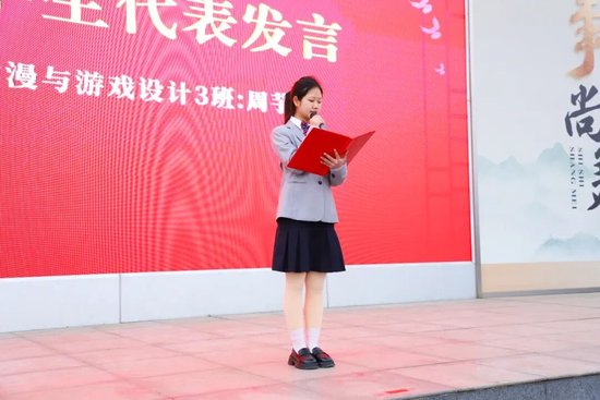 2024级动漫与游戏设计3班周芋源作为获奖代表发言,她感恩这份荣誉的肯定与鼓舞,分享了自己深耕专业、课上课下潜心钻研、积极参赛并斩获多项荣誉的经历,坦言荣誉亦是责任,希望全校同学以勤学长知、以苦练精技、以创新求进,以德立身、以技立业,成长为德技并修的新时代职教人才。