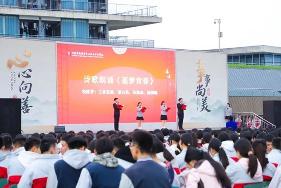升旗仪式后,廖心怡、兰景思雨、杨闵皓、吴谨成四位同学带来诗歌朗诵《逐梦青春》。以灵动的语言勾勒青春的多彩模样,将青苏校园景致与职教少年的奋进之志相融,诠释了学校“好瓷胜玉”的育人初心和办学追求。他们以青春之名号召大家以奋斗为笔、初心为舵,接好青春奋斗的接力棒,让青苏少年的逐梦之声在校园久久回荡,点燃全场师生的奋进热情。