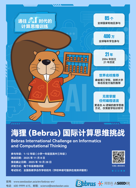 海狸(Bebras)国际计算思维挑战于 2004年创立,它是一项面向全球青少年的计算思维与信息学教育活动,旨在通过趣味性的题目激发学生对计算机科学的兴趣,在不需要掌握任何编程语言的前提下,培养他们用计算机和逻辑思维去解决问题的能力,是一项辅助学校AI教育的优质活动。