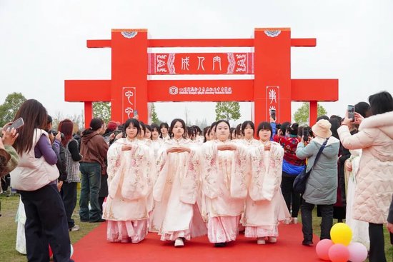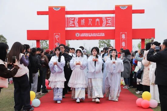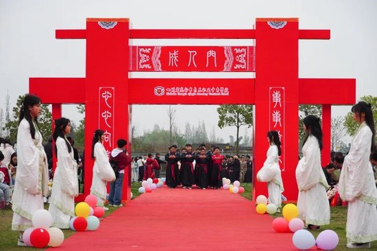 伴随着庄严的升旗仪式,活动正式拉开序幕。莘莘学子身着汉服,神情庄重,在悠扬的礼乐声中,有序步过“成人门”。这一步象征着他们正式告别少年时代,肩负起成人的责任与使命。