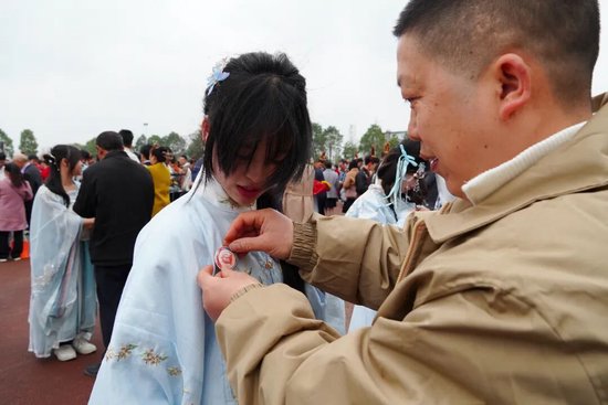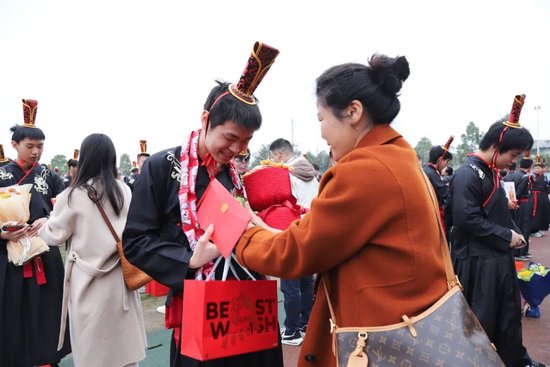家书抵万金,聆训动人心。家长就位后,高三学子们双手奉上亲笔信笺,那些平日里羞于表达的爱意,化作字里行间的深情。家长们为孩子佩戴成人徽章,赠送成人礼物,并进行饱含深情的聆训。最后,高三学子们向父母行三拜大礼,感谢生养、启蒙、卫护之恩。揖谢礼成,古礼今承,高三学子们在文化传承中完成了精神的成年礼。