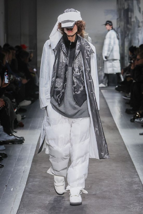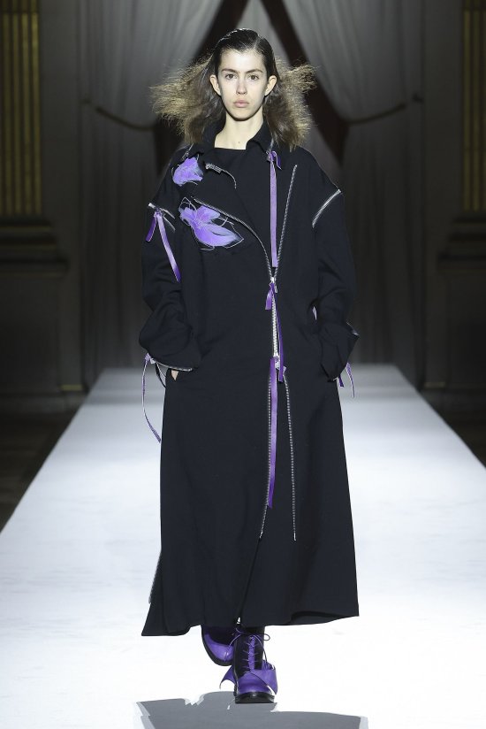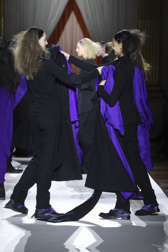 折叠与展开是山本耀司设计语言的核心,每个设计象征皆蕴藏着对立统一的。而这一切都存在于服装的历史与身体的生命历程之中。这种服装的两面性在山本耀司本季的男装系列中得以充分体现,尤其呈现于一系列精工制作的双面可穿大衣上。这些大衣两面皆可穿着,变换外观与质感,成为整个系列的象征。