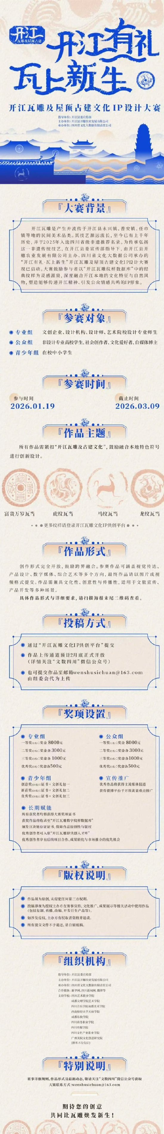作品征集时间为2026年1月19日至2026年3月9日。参赛者可选择以下方式提交:线上提交——通过“开江瓦雕文化IP共创平台”上传(预计2月底开放,详情关注“文数四川”微信公众号);邮箱提交——将参赛作品以压缩包形式发送至大赛官方邮箱:wenshusichuan@163.com,邮件请注明参赛组别与作品名称,作品由组委会代为上传。