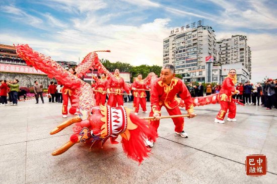 活动现场,非遗展演精彩纷呈:舞龙舞狮气势如虹,巴渝战舞刚劲豪迈,翻山铰子清脆响亮。