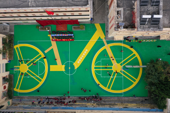 校长贾毅介绍:“这块环保篮球场的建成对于孩子们来讲意义特殊,虽然这里的学生们都没见过共享单车,但是通过我们的讲述和他们自身的想象,以及触手可及的塑胶球场,激发了他们想要走出大山,去见识更广阔世界的意愿。”